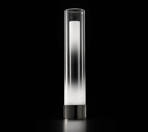 Description: Table lamp composed of two clear glass cylinders, one included in the other, with white smoked effect for convergent fades. Metal base with iron grey finish. Modern Catalogue Incanto. DIMENSIONS